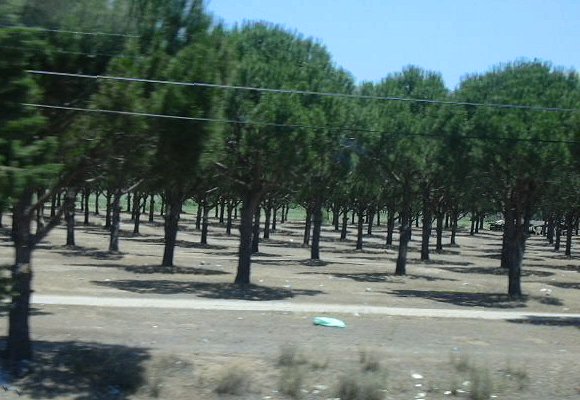 ![]() | ▲ワンポイント! この木何の木!? 左の写真は、車中から撮影した松林。海岸沿いには、植林された松が点在しています。 トルコでは木材としても利用されており、ポプラに次いでメジャーな木。しかしながら、松と言っても日本のそれとは随分異なる様相。 降雨量が少ないためか、下枝がなく丈も低いので、このようにまぁ〜るいシルエットです。 ポプラ並木は都心にも田舎にもありますが、ポプラ林の一部が切り拓かれて白い石が置かれている所は、トルコの一般的なお墓。 ちなみに、トルコではすべて土葬になります。白い布に包んでポプラの木の間に‥‥。 NG写真になりますが、ポプラの木はコチラ。 トルコのお墓はコチラ。 | ||