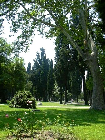 トプカプ宮殿内の庭園より。 常緑樹の緑や季節の草花に溢れていました。かなりの樹齢の大木もあります。木陰は涼しい‥‥。小鳥のさえずりも聞こえてきます。 | ||